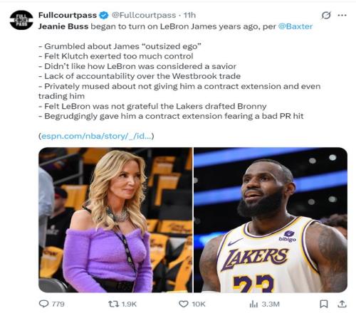 美媒总结了这篇长文中珍妮-巴斯不满詹姆斯的多个细节: